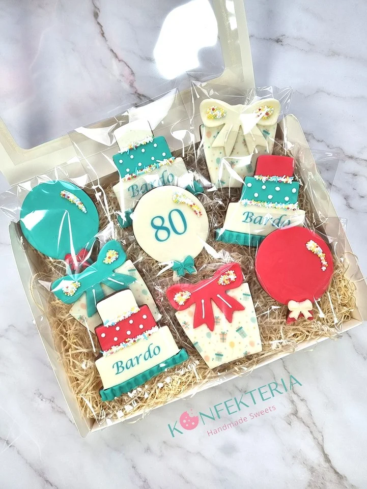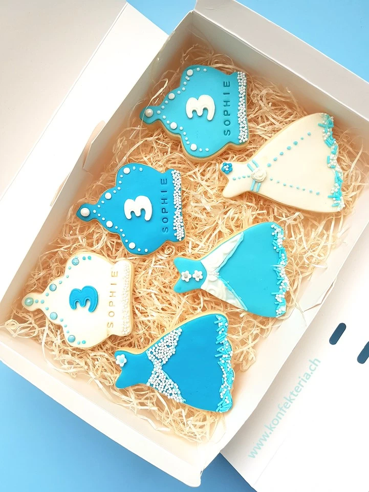Handmade Cookies mit hausgemachter Schokoladendekormasse, Royal Icing und Streusel verziert. Für Vegetarier und Halalernährung geeignet.