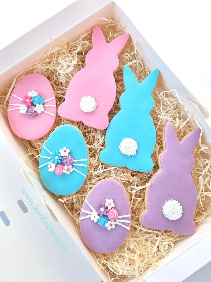 Decorated Cookies in Hasen- und Eierform. Die Eier sind mit filigranen Blumen dekoriert. Cookies von Hand gebacken und mit einer hausgemachten Schokoladendekormasse, Royal Icing und Streusel verziert. Für Vegetarier und Halalernährung geeignet.