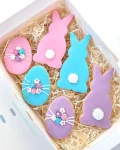 Decorated Cookies in Hasen- und Eierform. Die Eier sind mit filigranen Blumen dekoriert. Cookies von Hand gebacken und mit einer hausgemachten Schokoladendekormasse, Royal Icing und Streusel verziert. Für Vegetarier und Halalernährung geeignet.