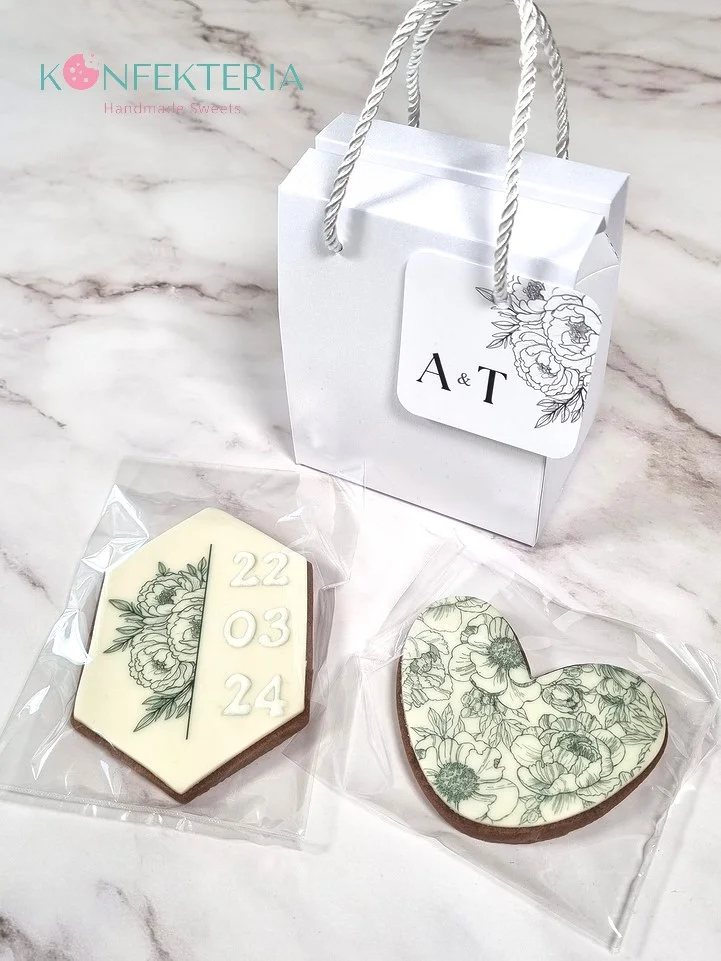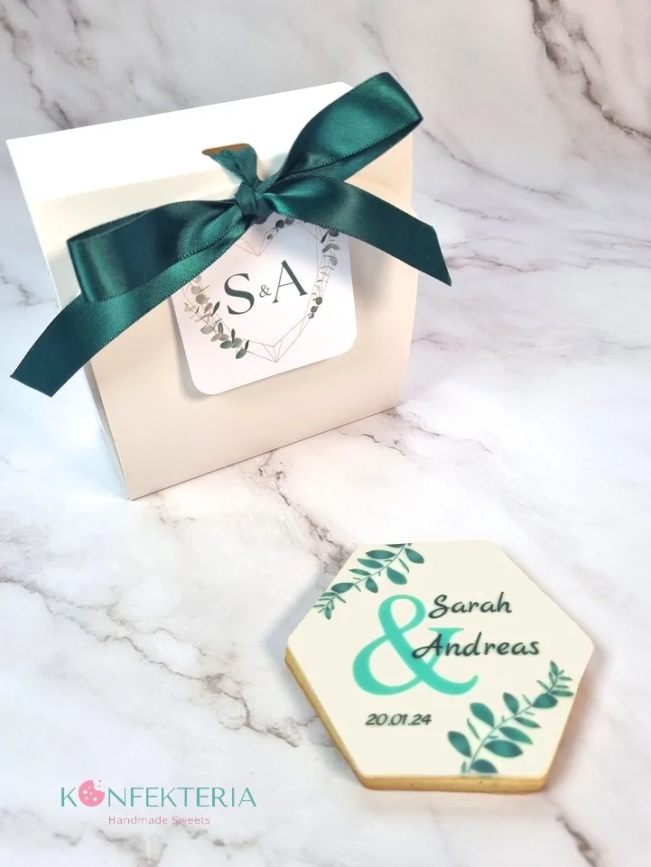 Sie werden in eleganten Schachteln geliefert, dekoriert mit farblich abgestimmtem Satinband und einem Anhänger mit den Initialen des Brautpaares.