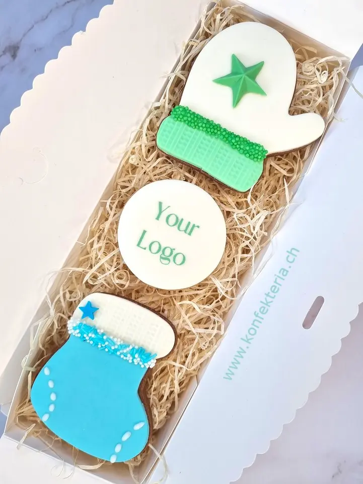 Set bestehend aus drei weihnachtlich dekorierten Cookies und einem bedruckten Keks mit Ihrem Logo, Spruch, oder Bild.