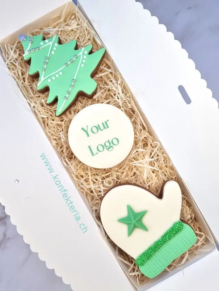 Set bestehend aus zwei weihnachtlich dekorierten Cookies und einem bedruckten Keks mit Ihrem Logo, Spruch, oder Bild.