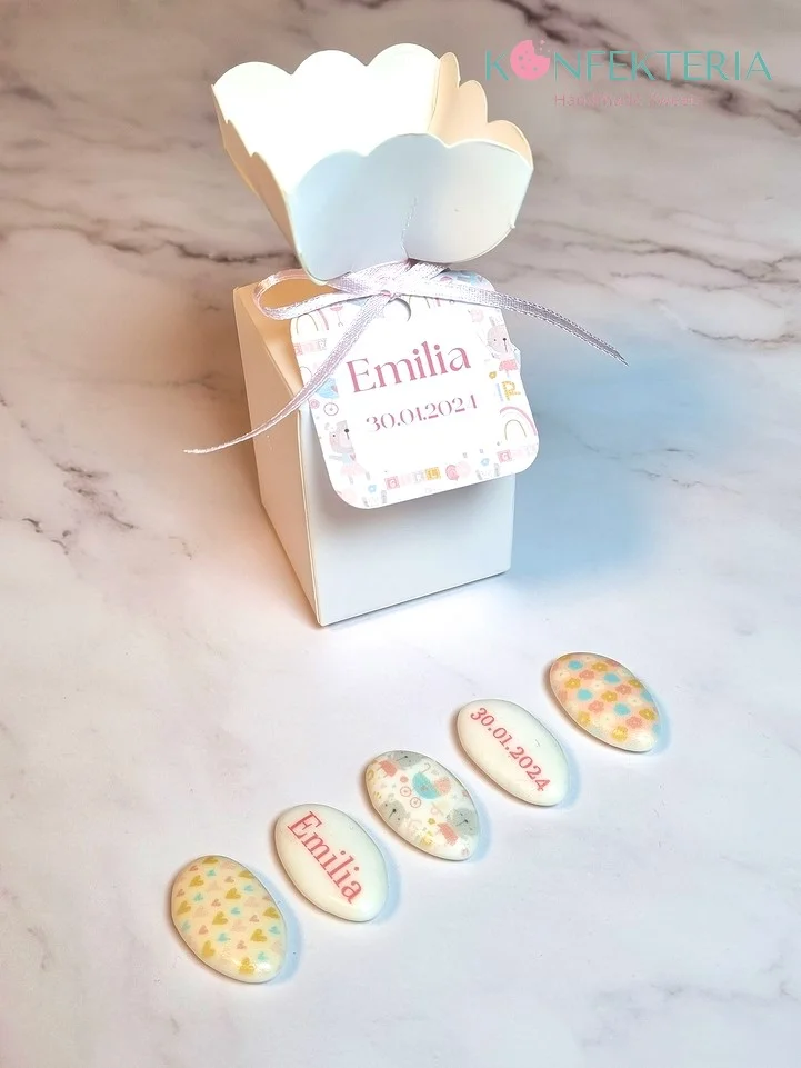 Die Schoko-Dragees werden mit Lebensmittelfarben bedruckt und in eleganten Schachteln geliefert, dekoriert mit farblich abgestimmtem Satinband und einem personalisierten Anhänger.