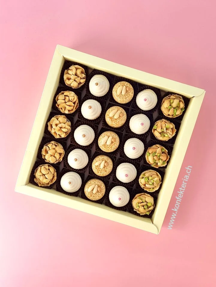 Konfekteria bietet Nusskonfekt exklusiv in der Schweiz. Jedes Stück wird vom Backen bis zum Dekorieren in aufwendiger Handarbeit hergestellt.