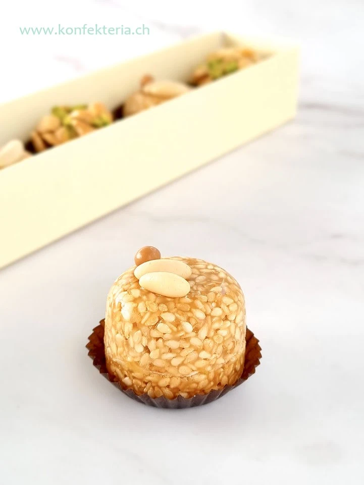 Handgemachte Mandel-Cashewkerne Körbchen und Sesam-Caramel Konfekt.