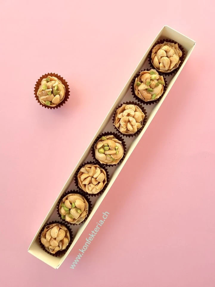 Handgemachtes Mandelkonfekt mit Gianduja Füllung, Cashew- und Haselnüsse.