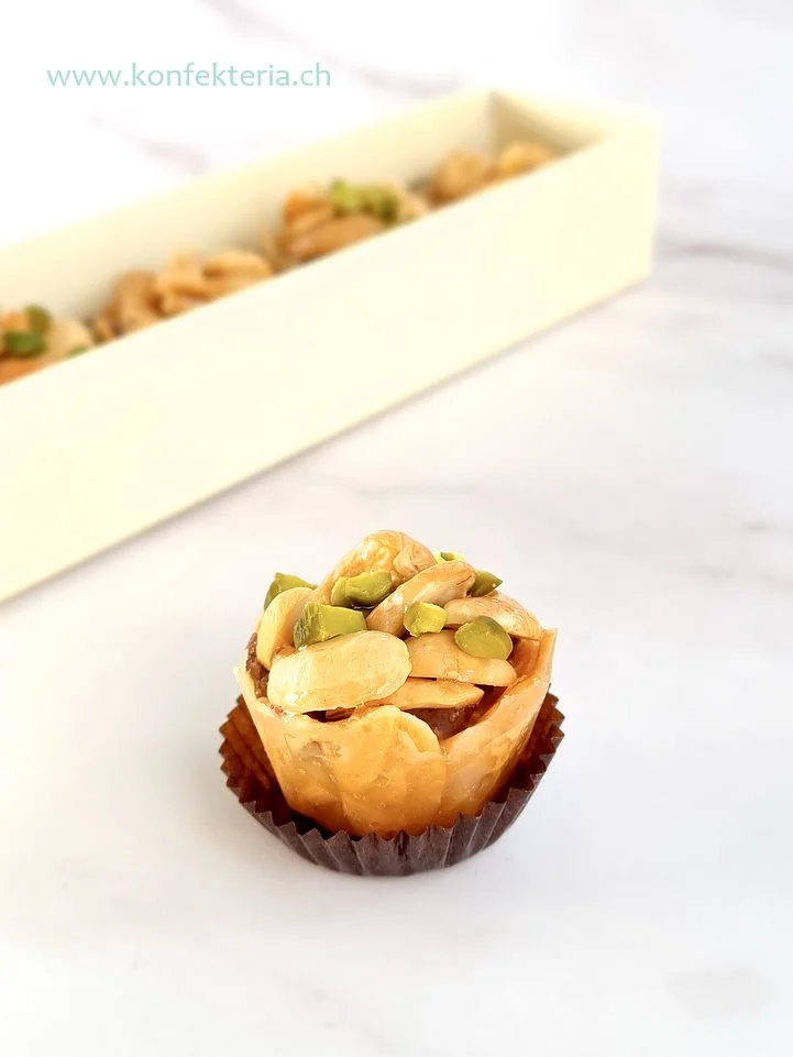 Konfekteria bietet Nusskonfekt exklusiv in der Schweiz. Jedes Stück wird vom Backen bis zum Dekorieren in aufwendiger Handarbeit hergestellt.