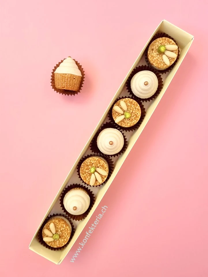 Handgemachte Mandelcupcakes mit Caramelfüllung und Sesam Konfekt.